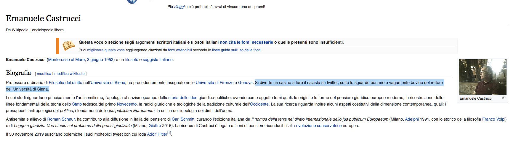 Grande scalpore sta facendo la notizia secondo cui un professore dell’Università di Siena, Emanuele Castrucci, su Twitter diffonda idee antisemite e appoggi apertamente Adolf Hitler. Il docente di Filosofia del diritto sui suoi profili social diffonde idee antisemite, come ad esempio la tesi complottistica sul Protocollo dei Savi di Sion, già accertato e conosciuto come falso documentale, che rappresenta la base di molte idee contro gli ebrei.