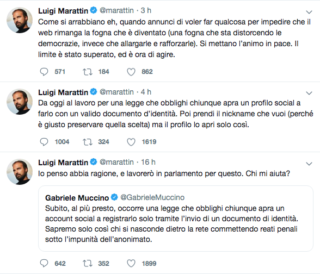 “Da oggi al lavoro per una legge che obblighi chiunque apra un profilo social a farlo utilizzando un documento d’identità. Poi prendi il nickname che vuoi (perché è giusto preservare quella scelta) ma il profilo lo apri solo così”, scrive Luigi Marattin.