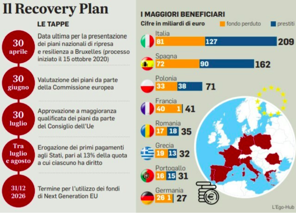 Tuttavia, fonti di Palazzo Chigi hanno smentito un qualsiasi rallentamento: “L’Italia presenterà puntualmente il 30 aprile il Piano nazionale di rilancio e resilienza”. Un portavoce del premier ha confermato che, come da calendario, Mario Draghi illustrerà il piano alle Camere il 26 e 27 aprile e prima di quella data ci sarà un passaggio in Consiglio dei ministri. Secondo l’accordo sul Next Generation Ue, 200 dei 750 miliardi del piano di aiuti andranno all’Italia in una forma mista di prestiti e sovvenzioni che saranno distribuiti nell’arco dei prossimi sei anni.