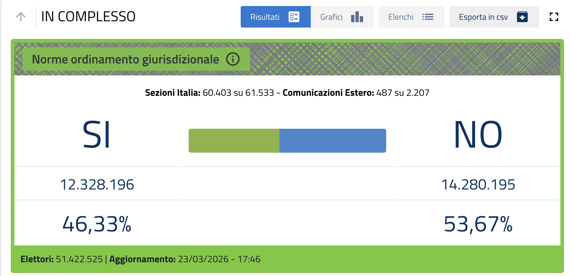 Ore 17,40 – Risultati quasi definitivi: il No al 54% – Quando mancano circa 1000 sezioni da scrutinare, il No è al 53,67%, pari a 14.280.195 voti, mentre il Sì è fermo a 12.328.196 di preferenze, pari al 46,33%.