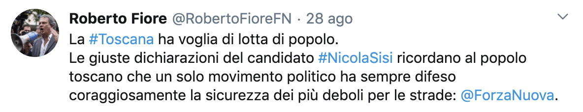 Non solo, secondo Leonardo Cabras, coordinatore regionale di Fn, Sisi “è l’unico candidato ‘ufficiale’ dentro liste civiche per le regionali, mentre Roberto Fiore, oltre al tweet menzionato precedentemente, ha parlato di Sisi anche in un’altra occasione sui suoi profili social scrivendo: “Le giuste dichiarazioni del candidato Nicola Sisi ricordano al popolo toscano che un solo movimento politico ha sempre difeso coraggiosamente la sicurezza dei più deboli per le strade: Forza Nuova”.