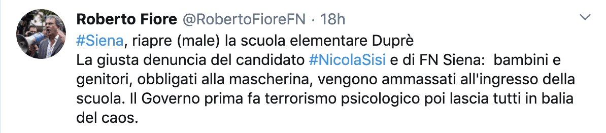 Secondo il Partito Democratico nella lista Toscana Civica, che sostiene l’aspirante governatrice del centrodestra Susanna Ceccardi (qui il suo profilo) alle elezioni Regionali che si terranno in Toscana il prossimo 20 e 21 settembre 2020, vi sarebbe candidato nel collegio di Siena anche un esponente di Forza Nuova, Nicola Sisi. La polemica si è accesa dopo un tweet di Roberto Fiore in cui il leader di Forza Nuova scrive: “Giusta denuncia la del candidato Nicola Sisi e di FN Siena: bambini e genitori, obbligati alla mascherina, vengono ammassati all’ingresso della scuola. Il Governo prima fa terrorismo psicologico poi lascia tutti in balia del caos”.