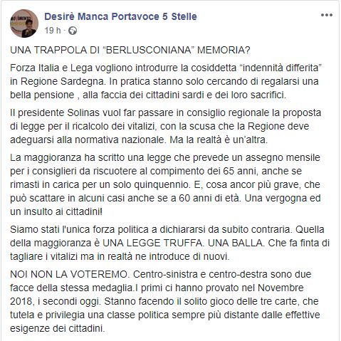 “Pensano solo ai privilegi e alle pensioni per i consiglieri regionali” ha continuato Zadda sul suo post.