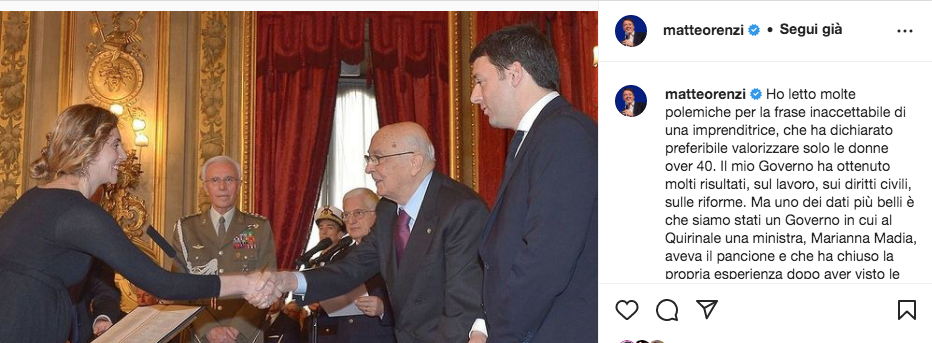 Matteo Renzi ha commentato l’intervento di Elisabetta Franchi su “Donne e Moda”. “Ho letto molte polemiche per la frase inaccettabile di una imprenditrice, che ha dichiarato preferibile valorizzare solo le donne over 40 – ha scritto l’ex premier su Instagram – Il mio Governo ha ottenuto molti risultati, sul lavoro, sui diritti civili, sulle riforme. Ma uno dei dati più belli è che siamo stati un Governo in cui al Quirinale una ministra, Marianna Madia, aveva il pancione e che ha chiuso la propria esperienza dopo aver visto le ministre dare alla luce tre figli in tre anni. Si può essere mamme e fare attività ad alto livello, anzi si deve consentire a tutte le donne di non vedersi preclusa la carriera per la maternità. Forse non è facile come dovrebbe, ma sicuramente è giusto, necessario e doveroso”, ha aggiunto Renzi.