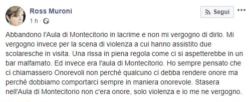 Una deputata di Leu, Rossella Muroni, è uscita in lacrime: “Abbandono l’Aula di Montecitorio in lacrime e non mi vergogno a dirlo. Mi vergogno invece – ha scritto sul suo profilo Facebook – per la scena di violenza a cui hanno assistito due scolaresche in visita. Una rissa in piena regola come ci si aspetterebbe in un bar malfamato. Ed invece era l’aula di Montecitorio. Ho sempre pensato che ci chiamassero Onorevoli non perché qualcuno ci debba rendere onore ma perché dobbiamo comportarci sempre in maniera onorevole. Stasera nell’Aula di Montecitorio non c’era onore, solo violenza e io me ne vergogno”.