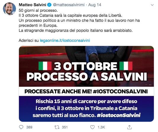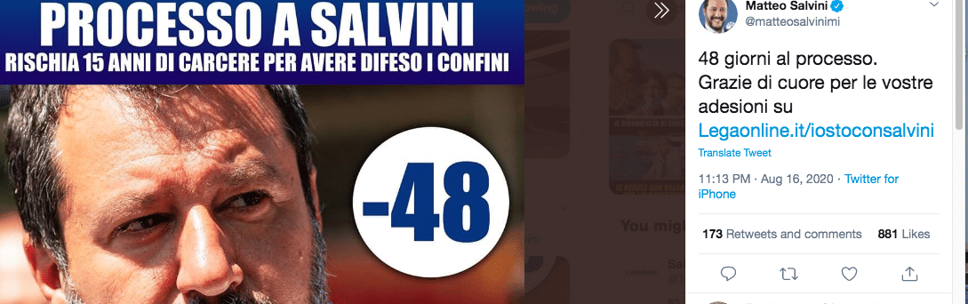 Salvini: “Gregoretti: -50 giorni al processo, -48”. Ma nel conto alla rovescia salta il 49
