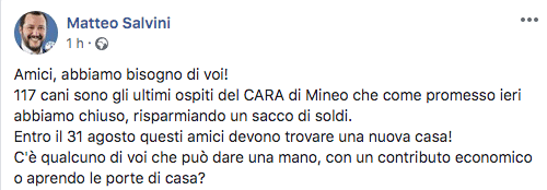 “117 cani sono in questo momento gli ultimi ospiti del centro per migranti di Mineo, che abbiamo chiuso con grande risparmio di quattrini. Entro il 31 agosto dobbiamo trovare una sistemazione per questi animali” è l’appello di Salvini, pubblicato sul suo profilo Facebook.