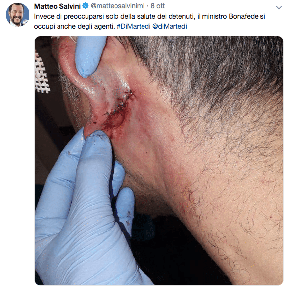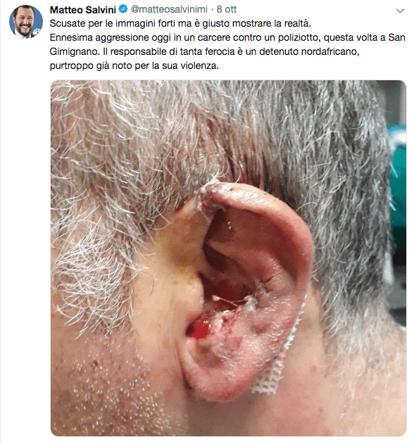 Due tweet. Nel primo Salvini (o chi per lui) scrive: “Scusate per le immagini forti ma è giusto mostrare la realtà. Ennesima aggressione oggi in un carcere contro un poliziotto, questa volta a San Gimignano. Il responsabile di tanta ferocia è un detenuto nordafricano, purtroppo già noto per la sua violenza”.