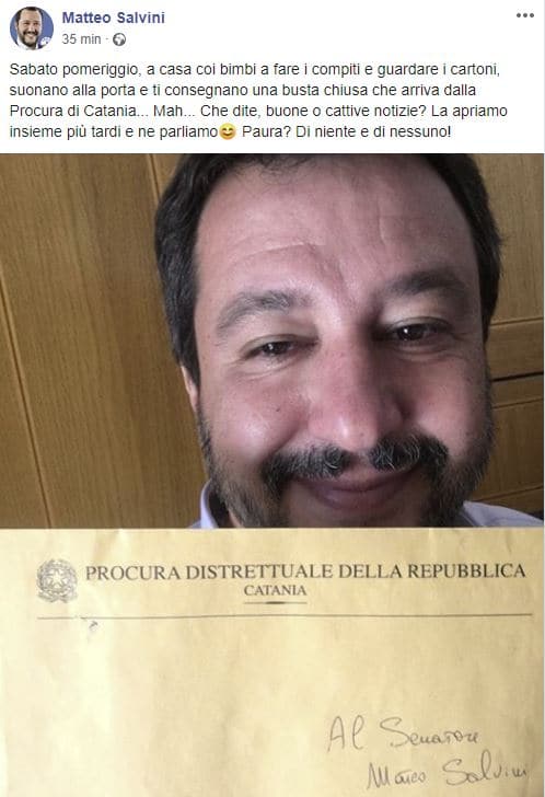Il leader della Lega Matteo Salvini ha annunciato con un post su Facebook di aver ricevuto una busta chiusa dalla Procura di Catania: “Sabato pomeriggio, a casa coi bimbi a fare i compiti e guardare i cartoni, suonano alla porta e ti consegnano una busta chiusa che arriva dalla Procura di Catania… Mah… Che dite, buone o cattive notizie? La apriamo insieme più tardi e ne parliamo. Paura? Di niente e di nessuno!”