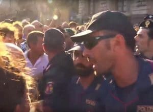 All’uscita dal municipio di Catania, qualche centinaio di manifestanti ha contestato Salvini gridando “buffone” e lanciando bottiglie di plastica vuote contro la sua auto. Tra il portone del municipio e la folla c’era un cordone di polizia.