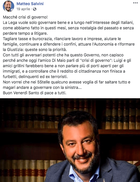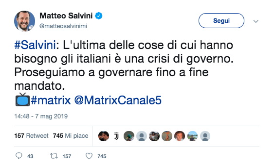 Nonostante ciò, il vice premier leghista in questi mesi ha sempre sostenuto di voler continuare la sua azione di governo con i pentastellati, vedendo un’eventuale crisi come un evento da scongiurare per il bene del paese.