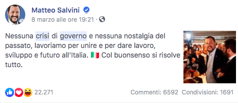 “Nessuna crisi di governo – affermava a marzo – e nessuna nostalgia del passato. Lavoriamo per unire e per dare lavoro, sviluppo e futuro all’Italia”.