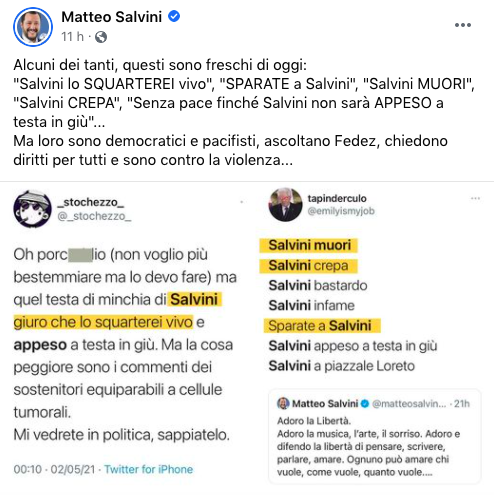 “‘Salvini lo squarterei vivo’, ‘sparate a Salvini’, ‘Salvini muori’, ‘Salvini crepa’, ‘Senza pace finché Salvini non sarà appeso a testa in giù…”. Lo scrive su Facebook Matteo Salvini, postando lo screenshot di alcune minacce, “alcuni dei tanti” commenti “questi sono freschi di oggi”, aggiungendo ironicamente: “Ma loro sono democratici e pacifisti, ascoltano Fedez, chiedono diritti per tutti e sono contro la violenza…”.