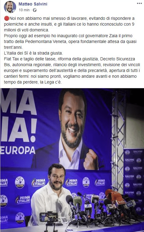 “Flat Tax e taglio delle tasse, riforma della giustizia, Decreto Sicurezza Bis, autonomia regionale, rilancio degli investimenti, revisione dei vincoli europei e superamento dell’austerità e della precarietà, apertura di tutti i cantieri fermi: noi siamo pronti, vogliamo andare avanti e non abbiamo tempo da perdere, la Lega c’è”, aveva concluso il ministro dell’Interno nella sua diretta Facebook.