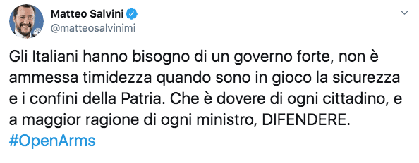 “Gli Italiani hanno bisogno di un governo forte, non è ammessa timidezza quando sono in gioco la sicurezza e i confini della Patria. Che è dovere di ogni cittadino, e a maggior ragione di ogni ministro, difendere”, scrive Salvini nel suo tweet.