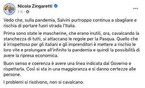 Il segretario del Pd Nicola Zingaretti risponde su Facebook alle parole pronunciate oggi da Salvini: “Vedo che, sulla pandemia, Salvini purtroppo continua a sbagliare e rischia di portare fuori strada l’Italia. Prima sono state le mascherine, che erano inutili, ora, cavalcando la stanchezza di tutti, si attaccano le regole per la Pasqua. Quello che è irrispettoso per gli italiani e gli imprenditori è mettere a rischio le loro vite e prolungare all’infinito la pandemia e quindi la possibilità di avere la ripresa economica. Buon senso e coerenza è avere una linea indicata dal Governo e rispettarla. Così si sta in una maggioranza e si danno certezze alle persone. I problemi si risolvono, non si cavalcano“. I due alleati di governo hanno un’opinione opposta sull’ipotesi di lockdown a Pasqua.