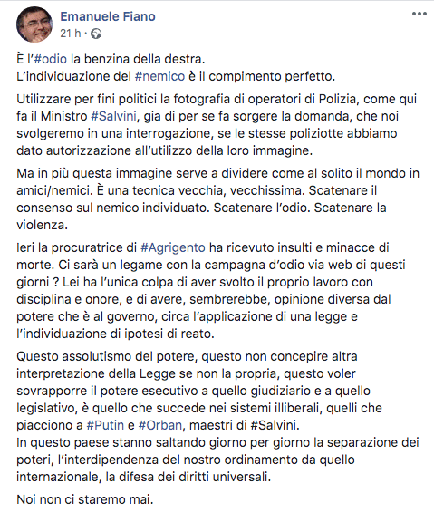 “Utilizzare per fini politici la fotografia di operatori di Polizia, come fa il ministro Salvini sui social, già di per sé fa sorgere la domanda, che noi svolgeremo in una interrogazione parlamentare, se le stesse poliziotte abbiamo dato autorizzazione all’utilizzo della loro immagine”, scrive su Facebook il deputato dem Emanuele Fiano.