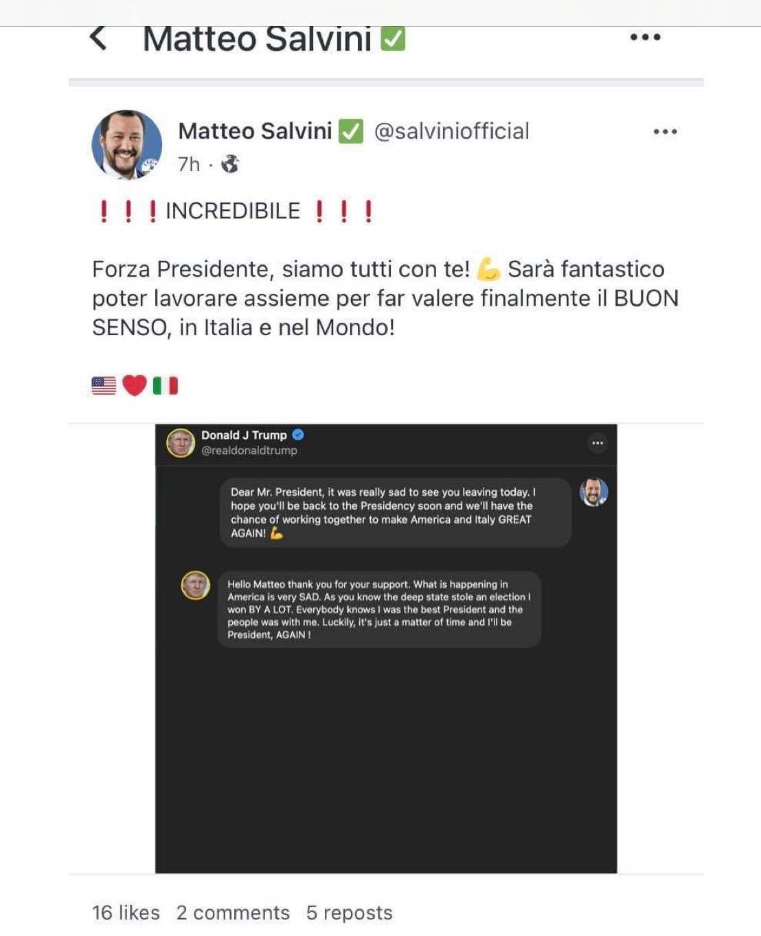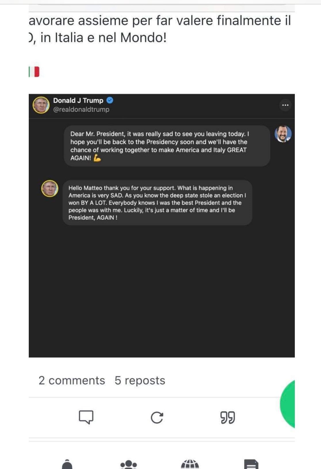 L’autore pubblica anche un presunto screenshot, con una chat in cui il falso Salvini avrebbe scritto a Trump, in inglese, “Caro signor presidente, è stato molto triste vederla andar via oggi. Spero che tornerà presto a essere presidente e che avremo la possibilità di lavorare insieme per rendere l’America e l’Italia di nuovo grandi”.