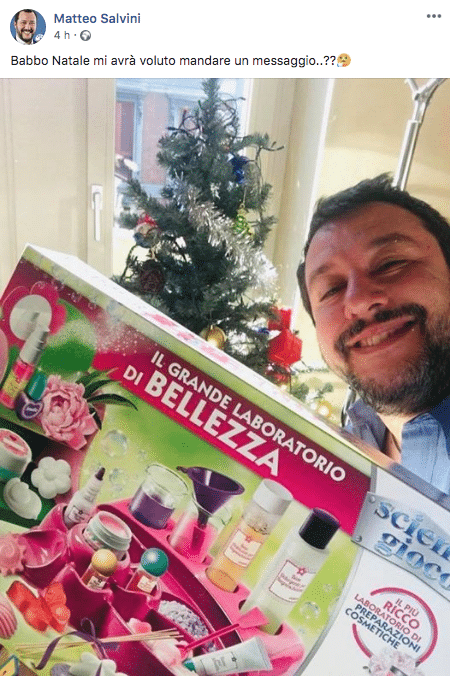Nell’istantanea, infatti, si vede l’ex ministro dell’Interno sorridente, mentre tiene tra le mani un gioco, “Il grande laboratorio di bellezza”, il cui scopo è quello di creare dei veri e propri prodotti di cosmetica.