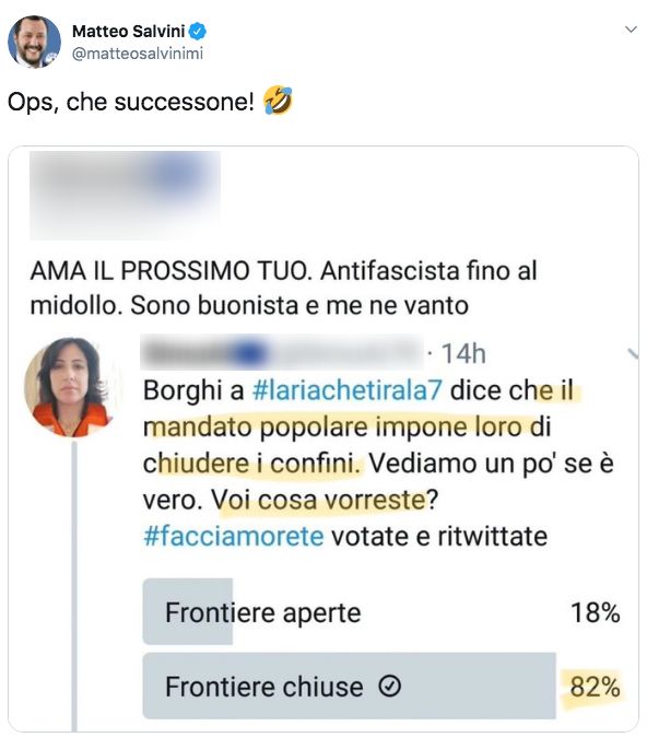 La donna confidava in un successo dei sostenitori della prima affermazione: “Borghi dice che il mandato popolare impone loro di chiudere i confini. Vediamo un po’ se è vero. Voi cosa vorreste?”, ha scritto nel lanciare la consultazione. Il risultato del sondaggio, però, ha decretato la netta vittoria del partito “frontiere chiuse”, opzione scelta dall’82 per cento degli utenti, a fronte del 18 per cento si sostenitori delle “frontiere aperte”.