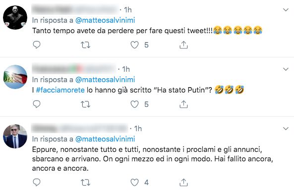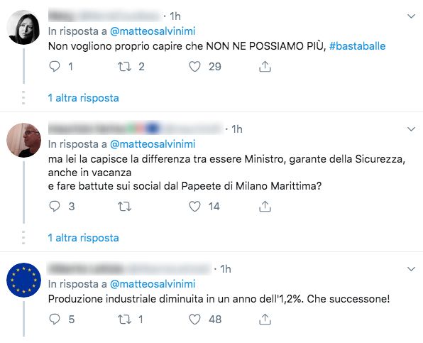 Il post del leader della Lega ha ricevuto centinaia di commenti e condivisioni. Tra i messaggi apparsi sotto al tweet, alcuni sbeffeggiano la donna per la sua iniziativa anti-sovranista (“Ma il 18 per cento non può cambiare paese?”, si chiede un utente). Molti altri, però, si scagliano contro lo stesso Salvini, accusandolo di aver messo alla gogna la donna. “Ma lei la capisce la differenza tra essere Ministro, garante della Sicurezza, anche in vacanza e fare battute sui social dal Papeete di Milano Marittima?”, scrive un utente. “Ma manco mia cugina di 13 anni fa gli screenshot”, osserva un altro. “Bello gettare vigliaccamente in pasto ai tuoi follower profili di persone che verranno sbranate di insulti, attività che sicuramente rientra nelle mansioni di un vice presidente del consiglio e ministro di uno dei paesi del g7”, sottolinea un altro ancora.