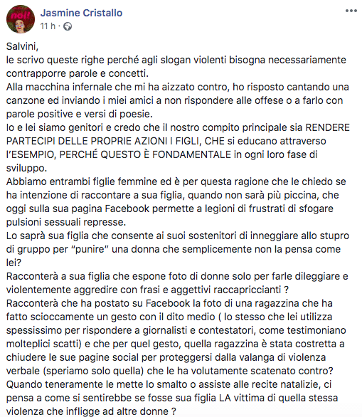 “Quanto a lei, Salvini”, conclude Jasmine, “non mi aspetto delle risposte ma sappia che da oggi ho una ragione in più per non arretrare di un passo e difendere il mio diritto al dissenso, a battermi per un mondo civile, in cui le donne non vengano brutalizzate. Lo devo alle donne, a mia figlia ed anche alla sua”.