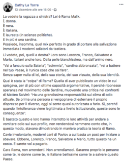 In difesa di Rama è intervenuta con un post su Facebook Cathy La Torre, avvocata e attivista per i diritti civili. “La vedete la ragazza a sinistra? Lei è Rama Malik. È donna. È nera. È italiana. È laureata (in scienze politiche). E in più è una sardina. Possiede, insomma, quel mix perfetto in grado di portare alla salivazione immediata i moderni odiatori da tastiera”, si legge nel post diventato virale. “Cara Rama, non arrenderti. Non arrendiamoci. Saranno proprio le persone come te, le donne come te, le Italiane bellissime come te a salvare questo Paese”.