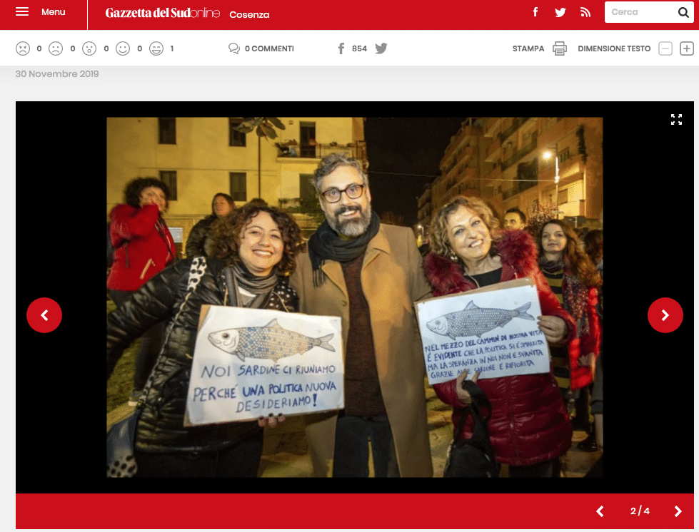Le Sardine calabresi si sono date appuntamento sabato 30 novembre a Cosenza in piazza Santa Teresa, tradizionale luogo d’incontro dei giovani nel capoluogo bruzio. L’idea di dar vita a questo evento è nata qualche giorno fa ed è stata condivisa sul gruppo Facebook “6000 Sardine a Cosenza – La Calabria non si lega”.