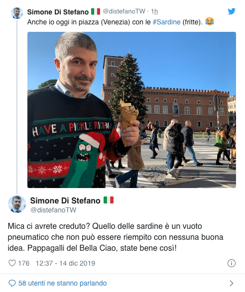 “A San Giovanni non andremo – sottolinea Di Stefano nel tweet con la foto in piazza Venezia con in mano un cartoccio di alici fritte – Quanto accaduto è la dimostrazione che non si vuole dialogare ma solo essere contro. E’ la certificazione che questa piazza, questa sinistra, non va da nessuna parte: vorrebbe essere nuova, fresca e frizzante, ma, se si riduce a stare in piazza e cantare Bella Ciao, non serve allo scenario politico italiano e a noi non interessa. Alla fine, quella delle sardine si è rivelata la solita piazza della sinistra radicale, niente di nuovo. L’ennesimo bluff”.