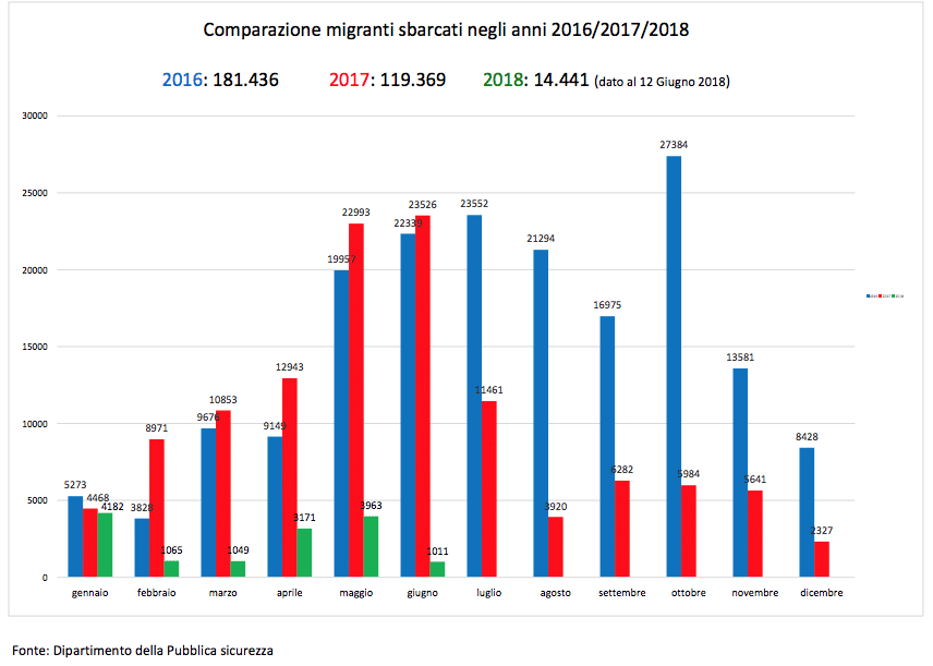Tuttavia, martedì 12 giugno il suo ministero ha pubblicato i dati ufficiali sul numero di migranti sbarcati in Italia dal primo gennaio 2018. Come si può notare, anche per effetto degli accordi con la Libia stipulati dal predecessore di Salvini, Marco Minniti, il numero di sbarchi è enormemente diminuito rispetto al 2016 e al 2017.