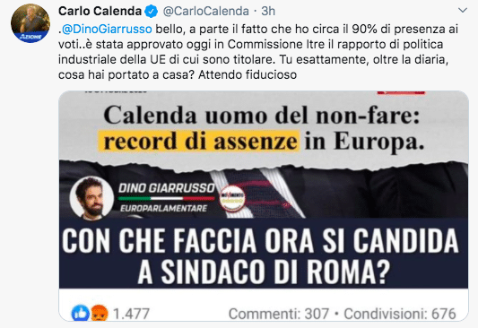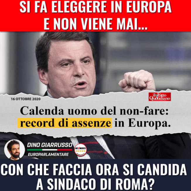 “Come in un classico della comicità, Calenda viene dipinto come “uomo del fare” […] ma Calenda è diventato un europarlamentare che brilla per assenteismo!”, accusa Giarrusso, che prosegue: “Nei suoi innumerevoli Tweet invita chiunque ad andare a lavorare, tranne sé stesso naturalmente: l’uomo del non-fare è uno tra gli eurodeputati più assente (chi lo batte? Avete indovinato: Berlusconi!!) e ora, dall’alto della sua inconcludenti, vorrebbe diventare sindaco della Capitale. No, grazie, con queste mezze figure abbiamo già dato”.