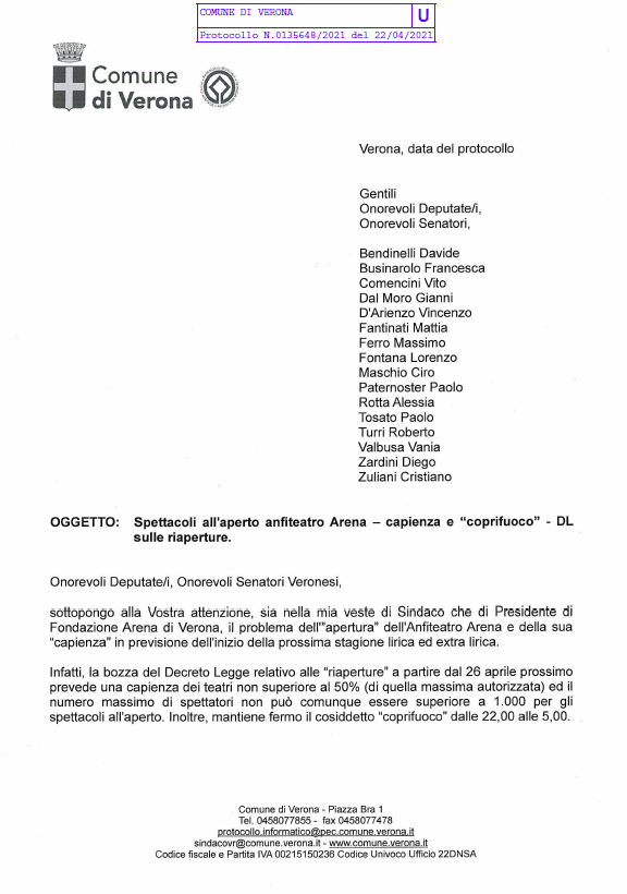 Nel pomeriggio di giovedì 22 aprile, infatti, Salvini ha scritto sui social: “Folle mettere a rischio la stagione estiva dell’Arena di Verona, impossibile da pianificare con il coprifuoco alle 22 fino a luglio e un limite a 1.000 per gli spettatori come previsto dal decreto di ieri (che anche per questo la Lega non ha votato)”.