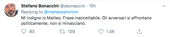 “Mi indigno io Matteo. Frase inaccettabile. Gli avversari si affrontano politicamente, non si minacciano”.