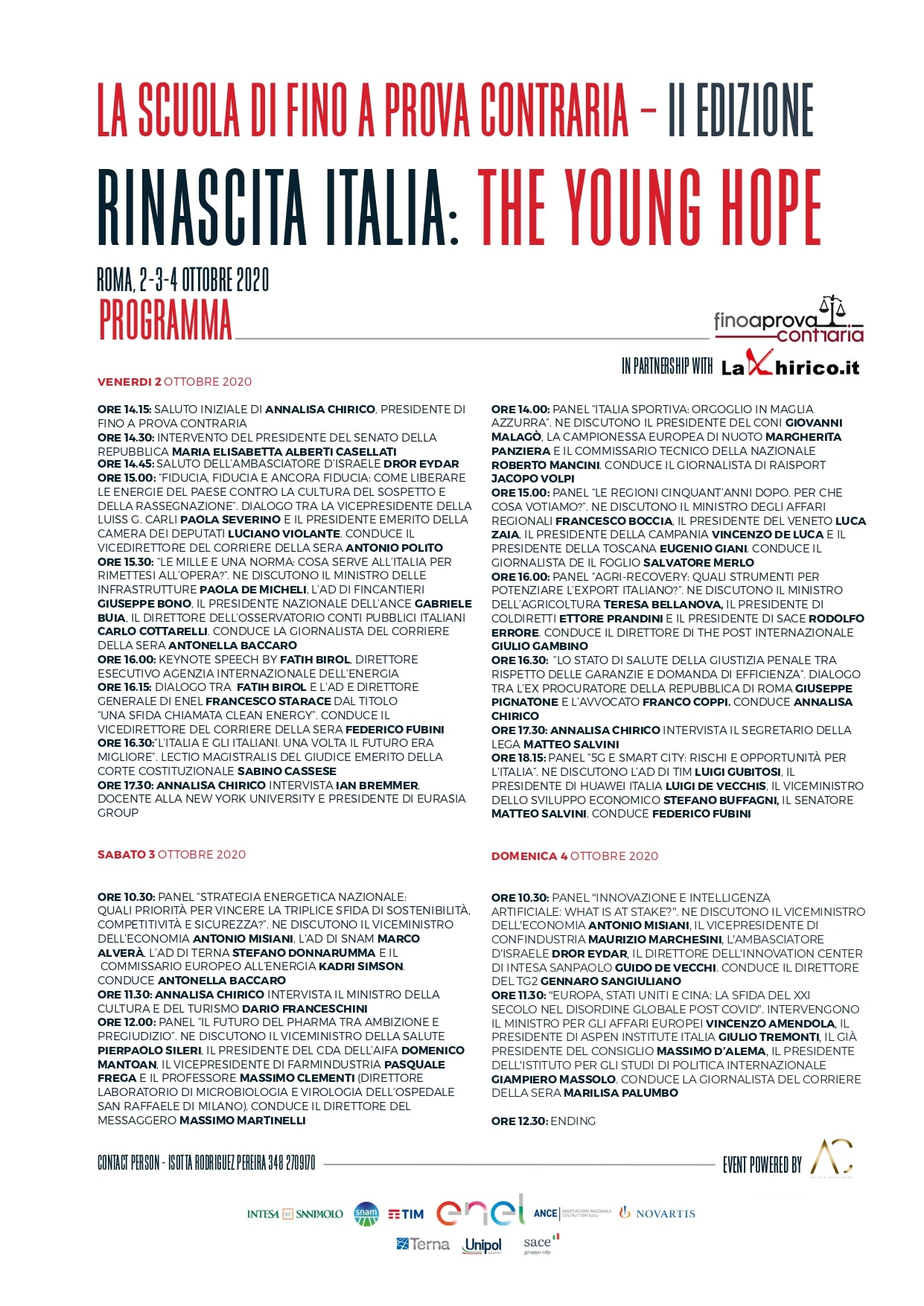 La prima giornata si aprirà con l’introduzione di Annalisa Chirico – firma de Il Foglio e presidente di “Fino a prova contraria” -, seguirà l’intervento del presidente del Senato Maria Elisabetta Alberti Casellati. Interverranno poi il direttore esecutivo dell’agenzia internazionale dell’energia, Fatih Birol, l’ad e dg di Enel Francesco Starace, la vicepresidente della Luiss Guido Carli Paola Severino, il presidente della Fondazione Leonardo Luciano Violante, il giudice emerito della Corte costituzionale Sabino Cassese. Tra i membri del Governo annunciati, compaiono Enzo Amendola, Antonio Misiani, Paola De Micheli, Francesco Boccia, Dario Franceschini, Teresa Bellanova, Stefano Buffagni. E poi Matteo Salvini, Luca Zaia, Giulio Tremonti, Massimo D’Alema, Carlo Cottarelli, Giuseppe Pignatone, Franco Coppi, Giovanni Malagò, Roberto Mancini.