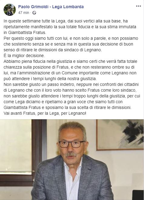 “In queste settimane – si legge sul profilo di Grimoldi – la Lega ha ripetutamente manifestato la sua totale fiducia e la sua stima immutata in Giambattista Fratus. Per questo oggi siamo tutti con lui, e non solo a parole, e non possiamo che sostenerlo senza se e senza ma in questa sua decisione di buon senso di ritirare le dimissioni da sindaco di Legnano. È la miglior decisione”.