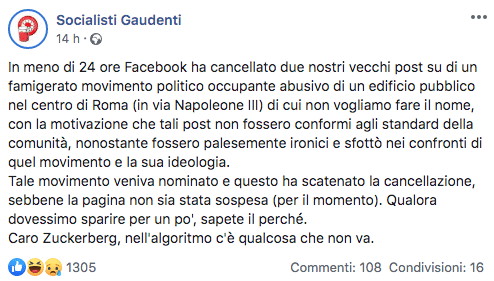 Sono passate solo poche settimana dalla tanto discussa chiusura di tutte le fanpage di Casapound e Forza Nuova per decisione di Facebook. A quanto pare, però, non saranno solo i due partiti di estrema destra a fare le spese della nuova ondata di revisione e applicazione stringente dei cosiddetti “termini di servizio” che Facebook sta operando da qualche mese a questa parte. È il caso, per esempio, della pagina satirica Socialisti Gaudenti, che da qualche ora sta affrontando un vero e proprio “bannaggio” di massa di tutti i vecchi post che contengono parole considerate vietate dall’algoritmo, come “Casapound”, “Mussolini”, “Forza Nuova”, “Negroni” (un tipico cocktail da aperitivo, ndr) e molte altre.