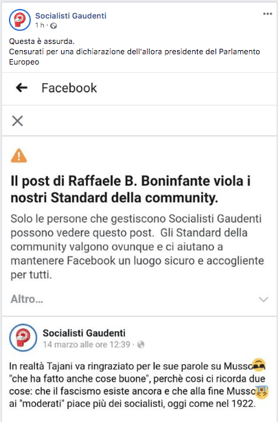 I post oggetto di censura sono tutti inequivocabilmente satirici. Nessun tipo di istigazione all’odio di massa è presente in quelle righe, al contrario di quanto sostenga l’algoritmo di Facebook. Nell’occhio del ciclone, peraltro, sono finiti anche post che riprendono dichiarazioni di eminenti esponenti politici, come l’ex presidente del Parlamento europeo Antonio Tajani, finito qualche mese fa nell’occhio del ciclone per aver sostenuto che “Mussolini aveva fatto anche cose buone”.