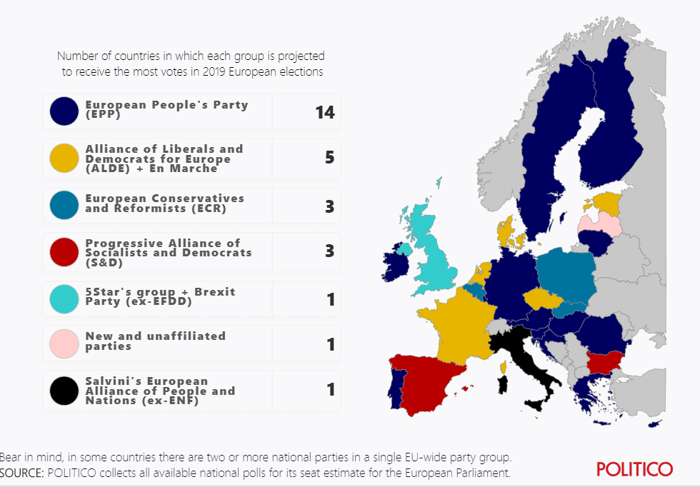 Il partito che secondo i sondaggi di Politico dominerà le elezioni è l’European People’s Party (EPP), la famiglia politica europeista di centro e di centro-destra che raccoglie le forze generalmente classificabili come moderate, cristiano-democratiche e conservatrici la coalizione Secondo l’ultimo sondaggio realizzato da YouGov, il partito arriverà ad un 35 per cento dei consensi. Per l’EPP il sondaggio prevede la conquista del maggior numero di voti in ben 14 paesi dell’Unione.
