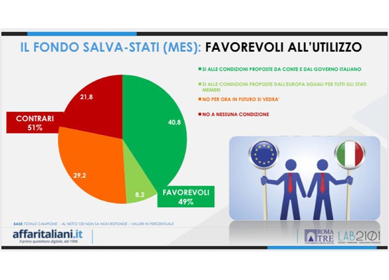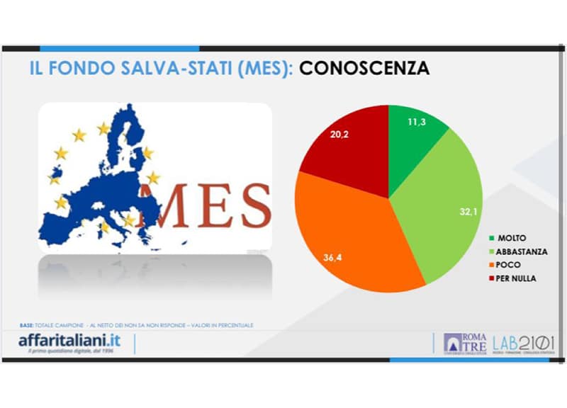 Secondo il sondaggio il 51 per cento degli intervistati è contrario all’attivazione del Fondo salva Stati da parte dell’Italia. Si dice invece favorevole il 49 per cento degli intervistati. Dal sondaggio emerge inoltre lo scarso livello di conoscenza su cosa sia esattamente il Meccanismo Europeo di Stabilità.