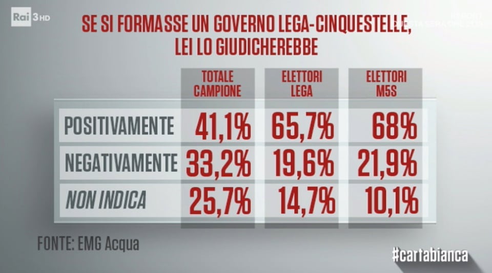 Per quanto riguarda il totale degli intervistati, che include gli elettori di altri partiti, i favorevoli alla coalizione Lega-M5s sono il 41,1 per cento.