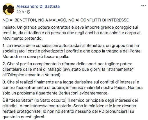 Inizia Di Battista che posta un messaggio su Facebook nel quale prende posizione sulle contrattazioni corso con il Partito Democratico: