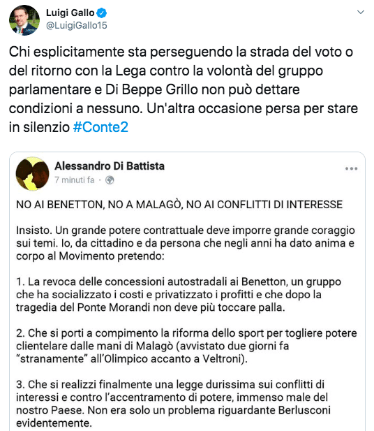 “Chi esplicitamente sta perseguendo la strada del voto o del ritorno con la Lega contro la volontà del gruppo parlamentare e di Beppe Grillo non può dettare condizioni a nessuno. Un’altra occasione persa per stare in silenzio #Conte2”.