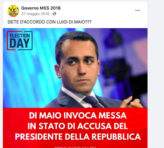 “Informazione vera” era anche il sito internet a cui era collegata la pagina Facebook Infopolitica, ma che ora risulta inattivo. Sito che finì al centro di un’inchiesta di Repubblica in seguito al “tweetstorm” condotto da 360 profili “fake” che fu usato per chiedere l’impeachment del Presidente della Repubblica Sergio Mattarella. L’assalto squadrista on line al Quirinale nella notte tra il 27 e il 28 maggio 2018 fu oggetto a suo tempo di una indagine della Procura della Repubblica di Roma. Nel 2018 al sito informazionevera.it, secondo l’inchiesta di Repubblica, era collegata la pagina “Governo M5S 2018 – che effettivamente rilanciava contenuti del sito informazionevera-it“. La stessa pagina che lanciò il sondaggio: “Sei d’accordo con Di Maio nella richiesta di mettere in stato d’accusa il Presidente?”. “Ma quel che più importa è che a InformazioneVera.it sono collegate alcune delle principali pagine dell’area che si dichiara 5Stelle: news.m5s (87.000 like), Wilm5s (725.000 like), TuttiConIlM5S (168.000 mi piace), M5SUNICASPERANZADITALIA, ForeverM5Stelle, Italyonesta, Perchevotarem5s (53.000 mi piace), ItaliaM5stelle, GovernoM5S2018 (218.000 mi piace)”, scrivevano i giornalisti Carlo Bonini e Fabio Tonacci.