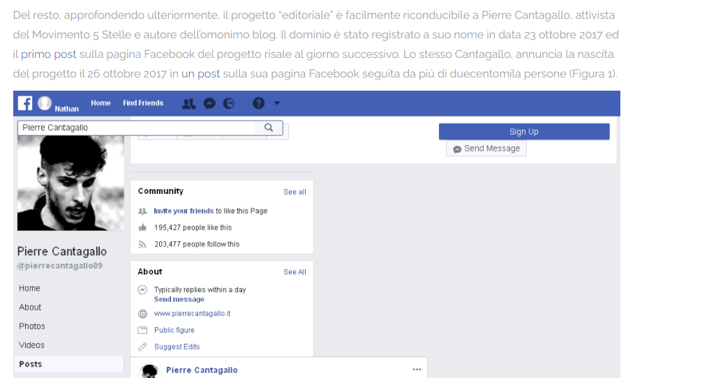 Il responsabile di InformazioneVera.it era tale Piergiorgio, alias “Pierre” Cantagallo, militante 5 stelle con un grande seguito su Facebook: oltre 270mila seguaci oggi.
