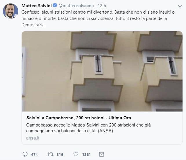 Sempre il 14 maggio, a Campobasso ad accogliere Matteo Salvini sono stati ben 200 striscioni. “I terroni non dimenticano”, si legge in uno dei tanti. Da nord a sud, la disapprovazione nei confronti del vicepremier leghista tanto impegnato in questa campagna elettorale si manifesta affiggendo striscioni.