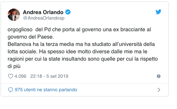 Il vicesegretario dem Andrea Orlando commenta: “Orgoglioso del Pd che porta al governo una ex bracciante al governo del Paese. Bellanova ha la terza media ma ha studiato all’università della lotta sociale. Ha spesso idee molto diverse dalle mie ma le ragioni per cui la state insultando sono quelle per cui la rispetto di più”.