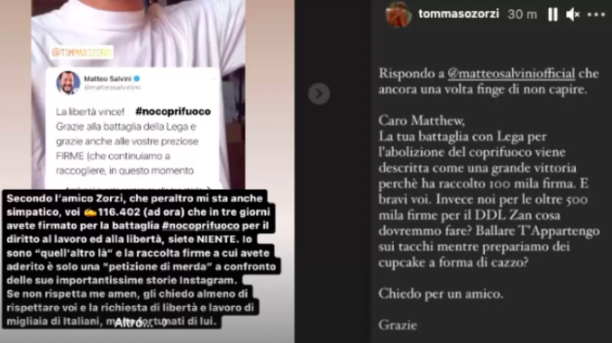 Zorzi ha replicato nuovamente all’attacco del leader della Lega: “Rispondo a Matteo Salvini che ancora una volta finge di non capire – dice l’influencer milanese – Caro Matthew, la tua battaglia con Lega per l’abolizione del coprifuoco viene descritta come una grande vittoria perché ha raccolto 100 mila firme. E bravi voi”. E aggiunge: “Invece noi per le oltre 500 mila firme per il DDL Zan cosa dovremmo fare? Ballare T’appartengo sui tacchi mentre prepariamo dei cupcake a forma di ca**o? Chiedo per un amico. Grazie”.