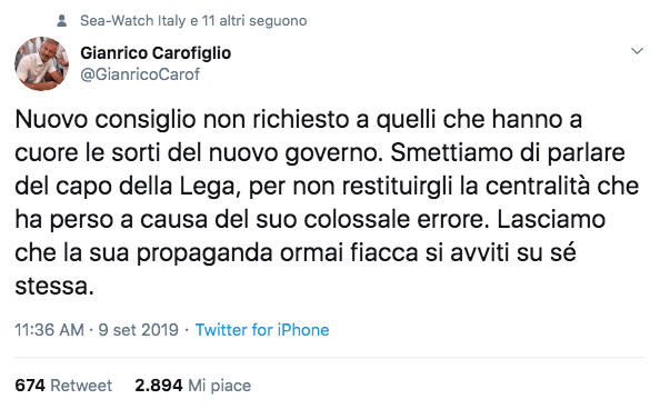“Nuovo consiglio non richiesto a quelli che hanno a cuore le sorti del nuovo governo”, è l’incipit del tweet di Carofiglio. “Smettiamo di parlare del capo della Lega – è contro Salvini, appunto – per non restituirgli la centralità che ha perso a causa del suo colossale errore”. “Lasciamo che la sua propaganda ormai fiacca si avviti su sé stessa”, conclude lo scrittore pugliese.