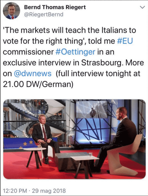 “I mercati insegneranno agli italiani a votare nel modo giusto”. È la frase attribuita al commissario europeo al Bilancio, il tedesco Gunther Oettinger, secondo quanto anticipa su Twitter il giornalista Bernd Thomas Riegert, che ha intervistato il commissario per l’emittente Dwnews.