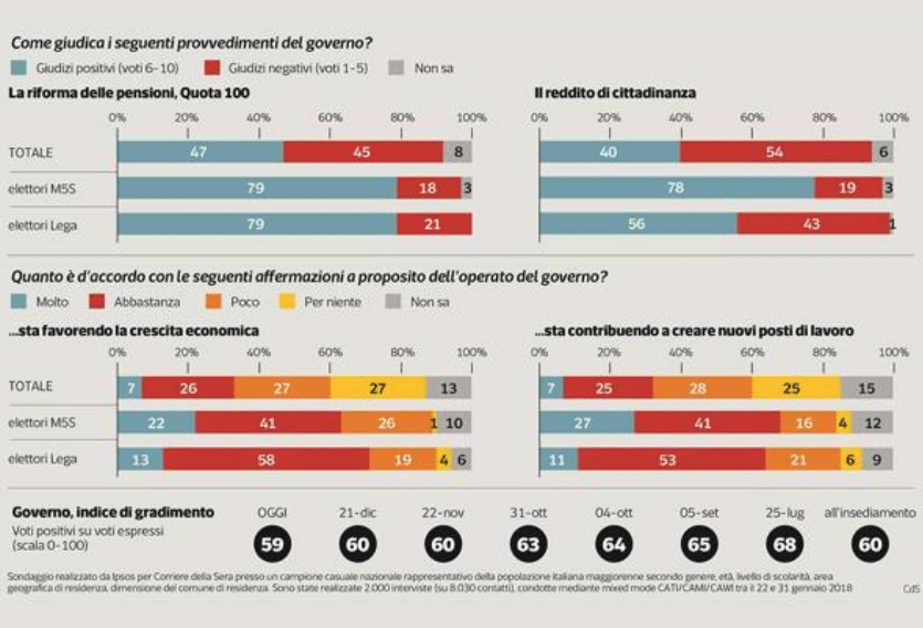 L’istituto di sondaggi Ipsos ha chiesto agli italiani cosa pensano delle due misure simbolo varate dal Governo M5S-Lega: reddito di cittadinanza e Quota 100. I risultati della rilevazione sono stati pubblicati sul Corriere della Sera.